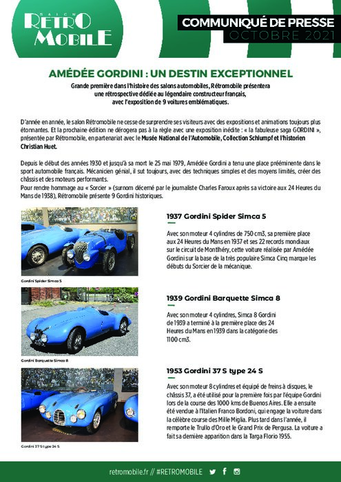 Grande première dans l’histoire des salons automobiles, Rétromobile présentera une rétrospective dédiée au légendaire constructeur français, avec l’exposition de 9 voitures emblématiques. D’année en année, le salon Rétromobile ne cesse de surprendre ses visiteurs avec des expositions et animations toujours plus étonnantes. Et la prochaine édition ne dérogera pas à la règle avec une exposition inédite : « la fabuleuse saga GORDINI », présentée par Rétromobile...