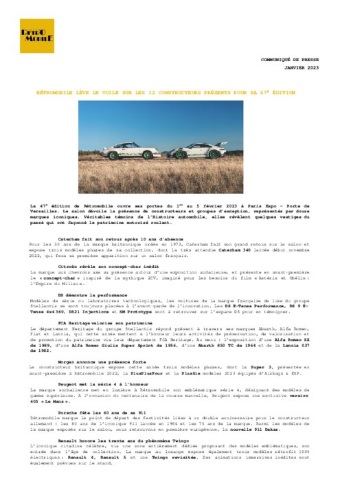 La 47e édition de Rétromobile ouvre ses portes du 1er au 5 février 2023 à Paris Expo– Porte de Versailles. Le salon dévoile la présence de constructeurs et groupes d’exception, représentés par douze marques iconiques. Véritables témoins de l’Histoire automobile, elles révèlent quelques vestiges du passé qui ont façonné le patrimoine motorisé roulant.