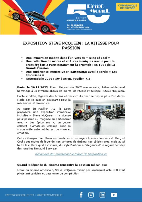 Pour célébrer son 50ème anniversaire, Rétromobile rend hommage à un symbole absolu de liberté, de vitesse et de style : Steve McQueen.