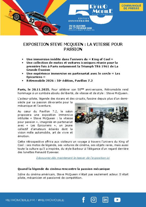 Rétromobile 2026 : exposition Steve McQueen, la vitesse pour passion