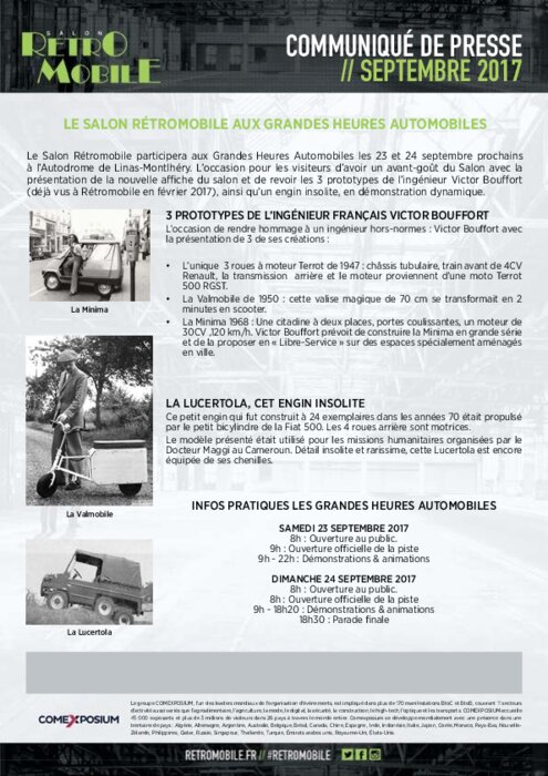 Le Salon Rétromobile participera aux Grandes Heures Automobiles les 23 et 24 septembre prochains à l’Autodrome de Linas-Montlhéry. L’occasion pour les visiteurs d’avoir un avant-goût du Salon avec la présentation de la nouvelle affiche du salon et de revoir les 3 prototypes de l’ingénieur Victor Bouffort (déjà vus à Rétromobile en février 2017), ainsi qu’un engin insolite, en démonstration dynamique.