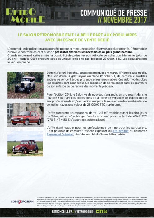 L’automobile de collection a toujours été perçue comme une passion réservée aux plus fortunés. Rétromobile prouve le contraire en continuant à présenter des voitures accessibles au plus grand nombre. Grande nouveauté cette année, la possibilité de présenter son véhicule de collection à la vente (plus de 30 ans - jusqu’à 1989) avec une seule et unique règle : ne pas dépasser 25 000€ TTC. Les populaires ont le vent en poupe !