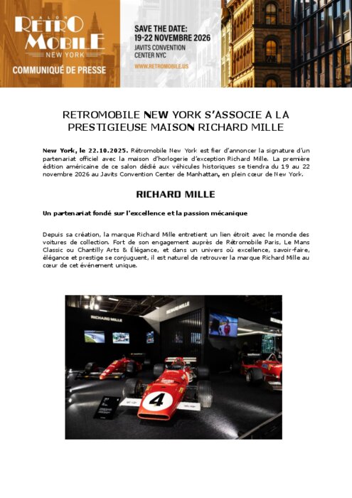 Rétromobile New York est fier d’annoncer la signature d’un partenariat officiel avec la maison d’horlogerie d’exception Richard Mille. La première édition américaine de ce salon dédié aux véhicules historiques se tiendra du 19 au 22 novembre 2026 au Javits Convention Center de Manhattan, en plein coeur de New York.