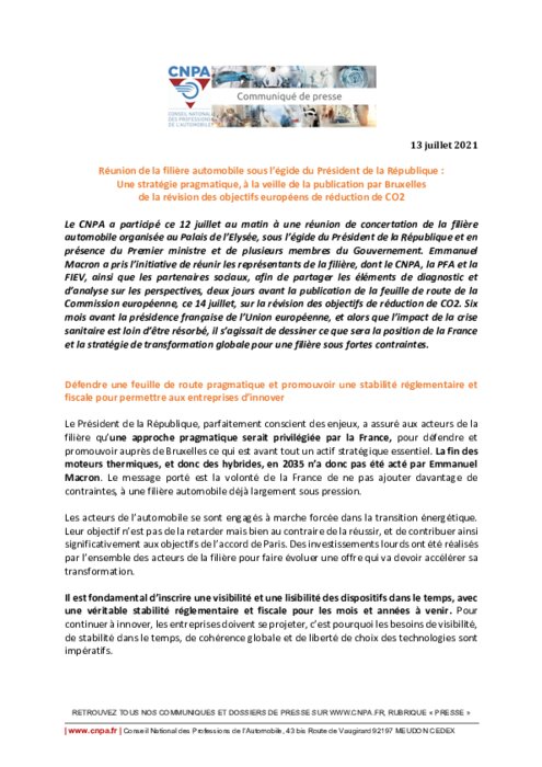 Le CNPA a participé le 12 juillet au matin à une réunion de concertation de la filière automobile organisée au Palais de l'Elysée, sous l'égide du Président de la République et en présence du Premier ministre et de plusieurs membres du Gouvernement...