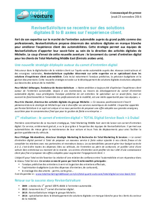 Fort de son expertise sur le marché de l’entretien automobile auprès du grand public comme des professionnels, ReviserSaVoiture propose désormais des solutions digitales en marque blanche pour améliorer l’expérience client des automobilistes. Cette stratégie permet aux équipes de ReviserSaVoiture d’apporter leur savoir-faire au sein de la direction des activités digitales de Michelin.