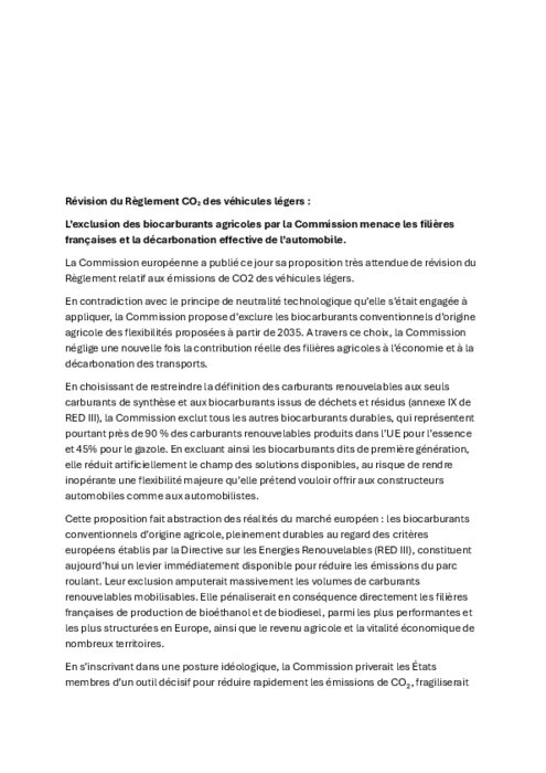 La Commission européenne a publié ce jour sa proposition très attendue de révision du Règlement relatif aux émissions de CO2 des véhicules légers. En contradiction avec le principe de neutralité technologique qu’elle s’était engagée à appliquer, la Commission propose d’exclure les biocarburants conventionnels d’origine agricole des flexibilités proposées à partir de 2035. A travers ce choix, la Commission néglige une nouvelle fois la contribution réelle des filières agricoles à l’économie et à la décarbonation des transports.