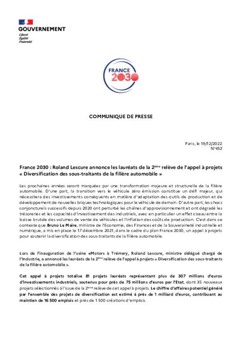 de la filière automobile ». Cet appel à projets totalise 81 projets lauréats représentant plus de 307 millions d’euros d’investissements industriels, soutenus pour près de 75 millions d’euros par l’Etat, dont 35 nouveaux projets sélectionnés à l’issue de la 2ème relève de cet appel.
