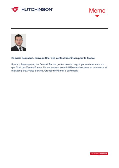 Equipementiers 13 mai 2015 - 11:44 Romaric Beaussart rejoint l’activité Rechange Automobile du groupe Hutchinson en tant que Chef des Ventes France. PDF (69 Ko) Télécharger