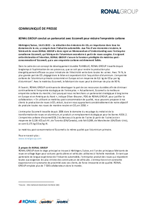 La réduction des émissions de CO2 en importance dans tous les domaines de la vie, y compris dans l'industrie automobile. Aux fins d'une économie circulaire, le fabricant de roues RONAL GROUP a donc signé un Memorandum of Understanding avec l'entreprise canadienne Eccomelt, qui fabrique de l'aluminium secondaire à partir de roues usagées. En signant cette déclaration d'intention, RONAL GROUP s'assure la livraison privilégiée de matériau postconsommation d'Eccomelt...