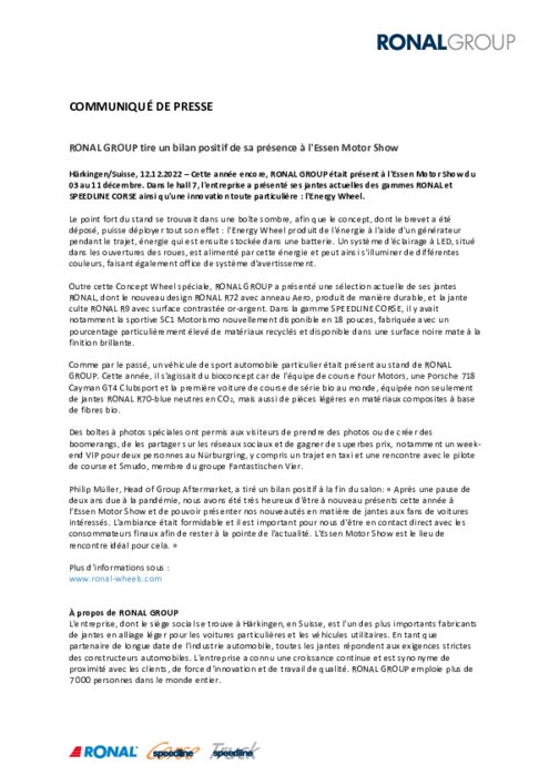 Cette année encore, RONAL GROUP était présent à l'Essen Motor Show du 03 au 11 décembre. Dans le hall 7, l'entreprise a présenté ses jantes actuelles des gammes RONAL et SPEEDLINE CORSE ainsi qu'une innovation toute particulière : l'Energy Wheel.