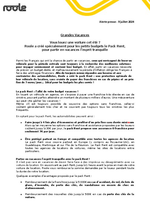 Parmi les Français qui ont la chance de partir en vacances, ceux qui envisagent de louer un véhicule pour la période estivale sont toujours à la recherche des meilleures solutions pour voyager sereinement et contenir leur budget. Afin de toujours mieux répondre aux besoins et aux contraintes des automobilistes, Roole a créé le pack Rent : une protection optimale de leur véhicule de location, sans crainte de payer des franchises en cas de pépins et au prix fixe de 7 euros/jour.