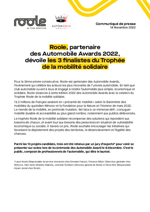 Roole : partenaire des Automobile Awards 2022, dévoile les 3 finalistes du Trophée de la mobilité solidaire