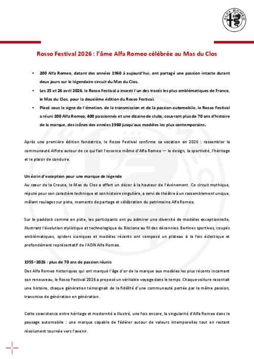 Constructeurs 27 avril 2026 - 10:11 Après une première édition fondatrice, le Rosso Festival confirme sa vocation en 2026 : rassembler la communauté Alfiste autour de ce qui fait l’essence même d’Alfa Romeo — le design, la sportivité, l’héritage et le plaisir de conduire. PDF (292 Ko) Télécharger