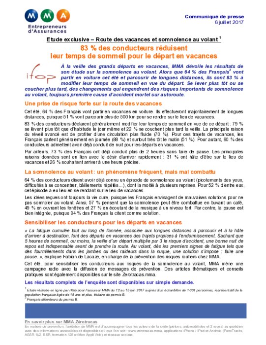 À la veille des grands départs en vacances, MMA dévoile les résultats de son étude menée avec l'Ifop sur la somnolence au volant. Alors que 64 % des Français vont partir en voiture cet été et parcourir de longues distances, ils sont 83 % à modifier leur temps de sommeil en vue du départ. Se lever plus tôt ou se coucher plus tard, des changements qui engendrent des risques importants de somnolence au volant, toujours première cause d’accident mortel sur autoroute.