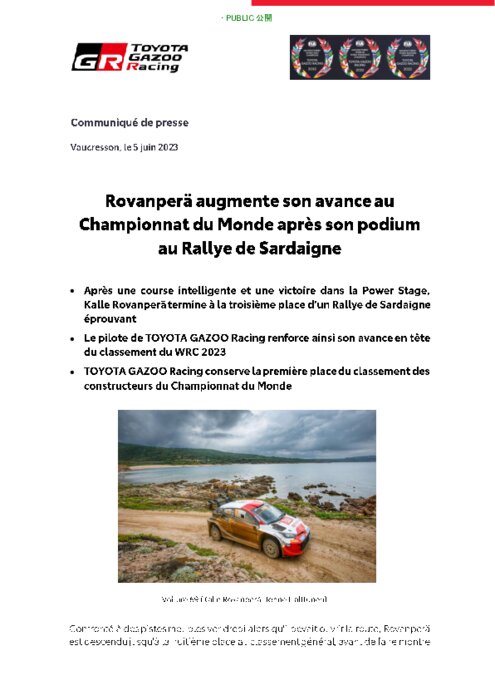 Après une course intelligente et une victoire dans la Power stage, Kalle Rovanperä termine à la troisième place d'un rallye de Sardaigne éprouvant. Le pilote de TOYOTA GAZOO Racing renforce ainsi son avance en tête du classement WRC 2023. Toyota Gazoo Racing conserve la première place du classement des constructeurs du championnat du monde.