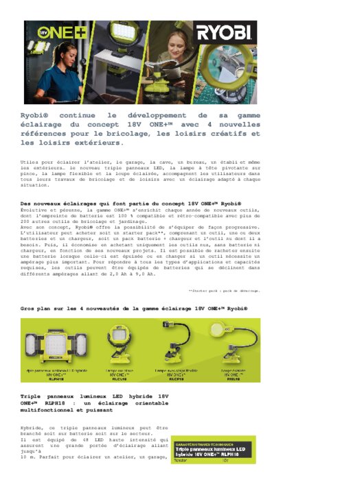 Des nouveaux éclairages qui font partie du concept 18V ONE+ Ryobi Évolutive et pérenne, la gamme ONE+ s’enrichit chaque année de nouveaux outils, dont l’empreinte de batterie est 100 % compatible et rétro compatible avec plus de 200 autres outils de bricolage et jardinage. Avec son concept, Ryobi offre la possibilité de s’équiper de façon progressive. L’utilisateur peut acheter soit un starter pack, comprenant un outil, une ou deux batteries et un chargeur, soit un pack batterie + chargeur.