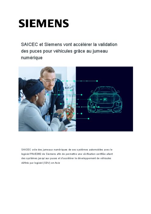 Siemens annonce que SAICEC, l’un des principaux fournisseurs de services de conception de puces et de systèmes pour l’industrie automobile, a commencé à créer des jumeaux numériques complexes d’architectures automobiles basés sur le logiciel PAVE360™ de Siemens, facilitant ainsi la vérification complète des composants automobiles, des systèmes jusqu’aux puces.