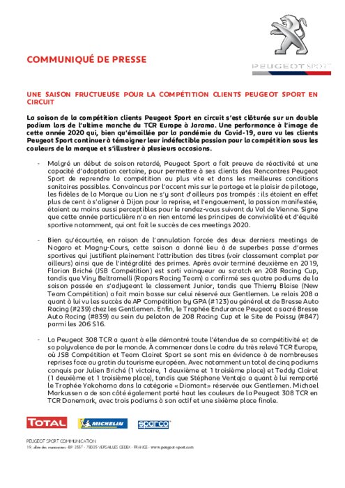 La saison de la compétition clients Peugeot Sport en circuit s’est clôturée sur un double podium lors de l’ultime manche du TCR Europe à Jarama. Une performance à l’image de cette année 2020 qui, bien qu’émaillée par la pandémie du Covid-19, aura vu les clients Peugeot Sport continuer à témoigner leur indéfectible passion pour la compétition sous les couleurs de la marque et s’illustrer à plusieurs occasions.
