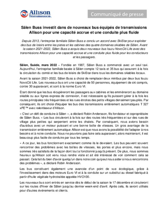 Fondée en 1987, Sälen Buss a commencé avec un seul taxi. Aujourd'hui, l'entreprise familiale basée à Sälen compte 12 taxis et 35 bus qui assurent à la fois la circulation du comté et les bus de loisirs de SkiStar dans tous les domaines skiables locaux. Avant la saison 2021-2022, Sälen Buss a choisi de remplacer deux minibus par deux bus Isuzu NovoCiti Life. Les nouveaux bus ont une capacité de 50 personnes, équipement de ski compris, contre 30 auparavant, et sont à la norme Euro VI.