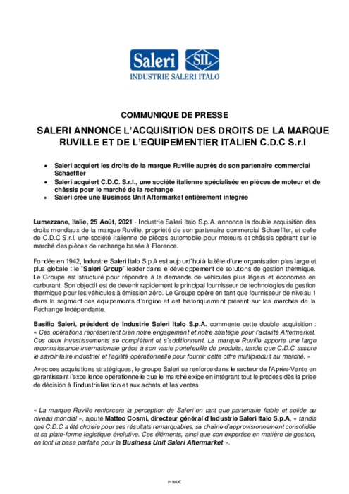 Industrie Saleri Italo annonce la double acquisition des droits mondiaux de la marque Ruville, propriété de son partenaire commercial Schaeffler, et celle de C.D.C S.r.l, une société italienne de pièces automobile pour moteurs et châssis opérant sur le marché des pièces de rechange basée à Florence.