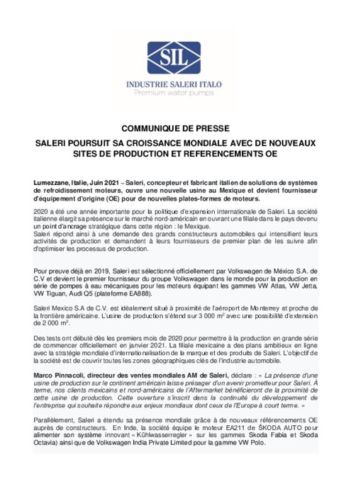 Equipementiers 10 juin 2021 - 10:34 Saleri, concepteur et fabricant italien de solutions de systèmes de refroidissement moteurs, ouvre une nouvelle usine au Mexique et devient fournisseur d'équipement d'origine (OE) pour de nouvelles plates-formes de moteurs. PDF (146 Ko) Télécharger
