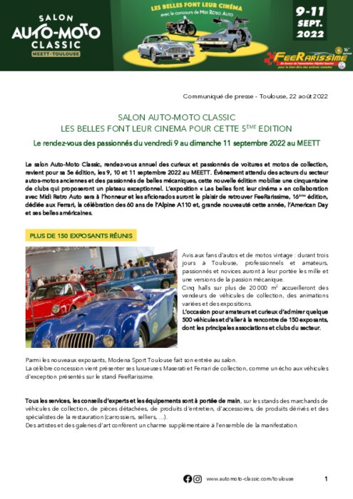 Le salon Auto-Moto Classic, rendez-vous annuel des curieux et passionnés de voitures et motos de collection, revient pour sa 5e édition, les 9, 10 et 11 septembre 2022 au MEETT. Évènement attendu des acteurs du secteur autos-motos anciennes et des passionnés de belles mécaniques, cette nouvelle édition mobilise une cinquantaine de clubs qui proposeront un plateau exceptionnel.