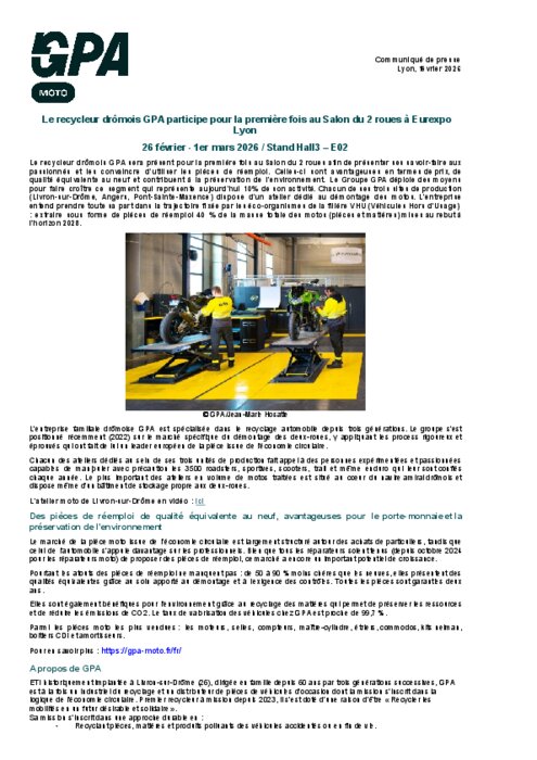 Le recycleur drômois GPA sera présent pour la première fois au Salon du 2 roues afin deprésenter ses savoir-faire aux passionnés et les convaincre d’utiliser les pièces de réemploi. Celles-ci sont avantageusesen termes de prix, de qualité équivalente au neuf et contribuent à lapréservation de l’environnement. Le Groupe GPA déploie des moyens pour faire croître ce segment qui représente aujourd’hui 10% de son activité.Chacun de ses trois sites de production (Livron-sur-Drôme, Angers, Pont-Sainte-Maxence) dispose d’un atelier dédié au démontage des motos.L’entreprise entend prendre toute sa part dans la trajectoire fixée par les éco-organismes de la filière VHU (Véhicules Hors d'Usage): extraire sous forme de pièces de réemploi40 % de lamassetotaledes motos(pièces et matières)mises au rebut à l’horizon 2028.