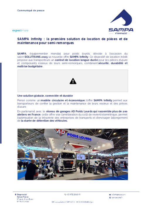 Sampa, équipementier mondial pour poids lourds, dévoile à l’occasion du salon Solutrans 2025 sa nouvelle offre Sampa Infinity. Ce dispositif de location inédit propose aux transporteurs un contrat de location longue durée pour les pièces d’usure et composants essieux de leurs semi-remorques, combinant sécurité, durabilité et maîtrise budgétaire.