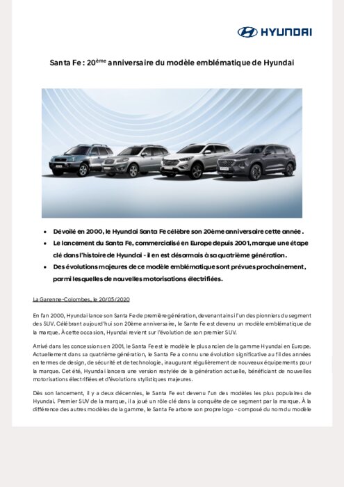 En l’an 2000, Hyundai lance son Santa Fe de première génération, devenant ainsi l’un des pionniers du segment des SUV. Célébrant aujourd'hui son 20ème anniversaire, le Sante Fe est devenu un modèle emblématique de la marque. À cette occasion, Hyundai revient sur l’évolution de son premier SUV.