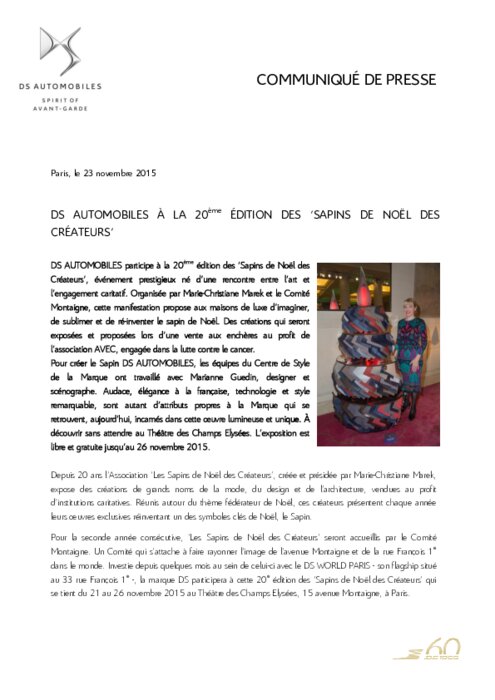 DS AUTOMOBILES participe à la 20ème édition des ‘Sapins de Noël des Créateurs’, événement prestigieux né d’une rencontre entre l’art et l’engagement caritatif. Organisée par Marie-Christiane Marek et le Comité Montaigne, cette manifestation propose aux maisons de luxe d’imaginer, de sublimer et de ré-inventer le sapin de Noël. Des créations qui seront exposées et proposées lors d’une vente aux enchères au profit de l’association AVEC, engagée dans la lutte contre le cancer.