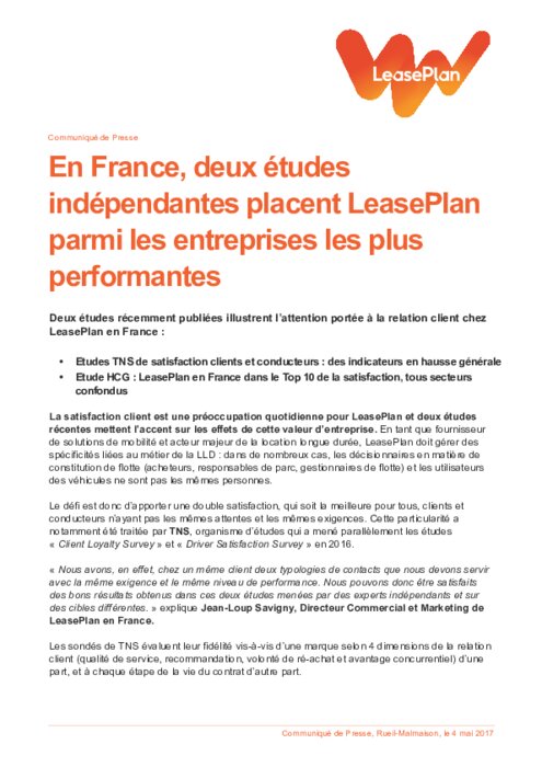 La satisfaction client est une préoccupation quotidienne pour LeasePlan et deux études récentes mettent l’accent sur les effets de cette valeur d’entreprise. La toute récente production de HCG France place LeasePlan à la 10e place de l’étude, avec une note de satisfaction globale de 14,7/20. Cette entrée de LeasePlan dans le Top 10 représente une progression de deux places par rapport à l’année précédente.