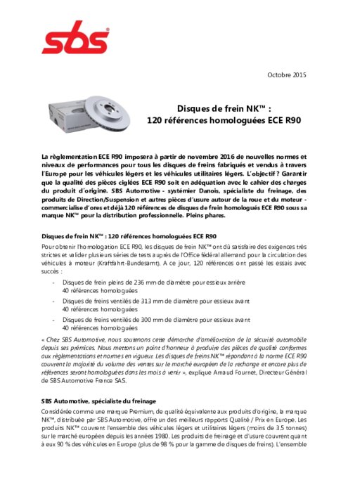 La règlementation ECE R90 imposera à partir de novembre 2016 de nouvelles normes et niveaux de performances pour tous les disques de freins fabriqués et vendus à travers l’Europe pour les véhicules légers et les véhicules utilitaires légers. SBS Automotive commercialise d’ores et déjà 120 références de disques de frein homologués ECE R90 sous sa marque NK pour la distribution professionnelle.