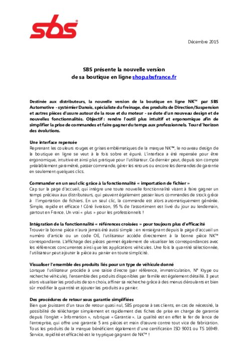 Destinée aux distributeurs, la nouvelle version de la boutique en ligne NK par SBS Automotive systémier Danois, spécialiste du freinage, des produits de Direction/Suspension et autres pièces d’usure autour de la roue et du moteur - se dote d’un nouveau design et de nouvelles fonctionnalités. Objectif : rendre l’outil plus intuitif et ergonomique afin de simplifier la prise de commandes et faire gagner du temps aux professionnels.