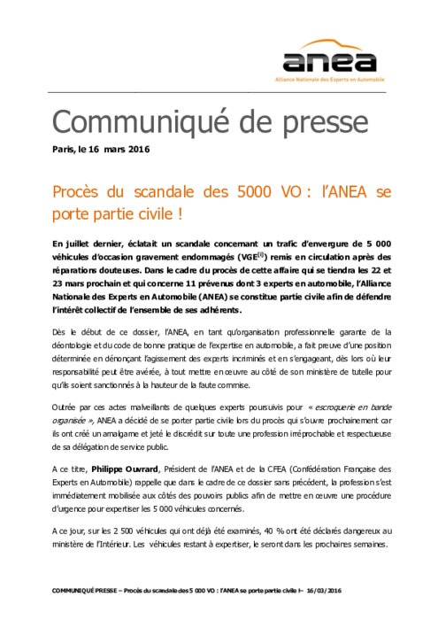 En juillet dernier, éclatait un scandale concernant un trafic d’envergure de 5 000 véhicules d’occasion gravement endommagés (VGE) remis en circulation après des réparations douteuses. Dans le cadre du procès de cette affaire qui se tiendra les 22 et 23 mars prochain et qui concerne 11 prévenus dont 3 experts en automobile, l’Alliance Nationale des Experts en Automobile (ANEA) se constitue partie civile afin de défendre l’intérêt collectif de l’ensemble de ses adhérents experts.