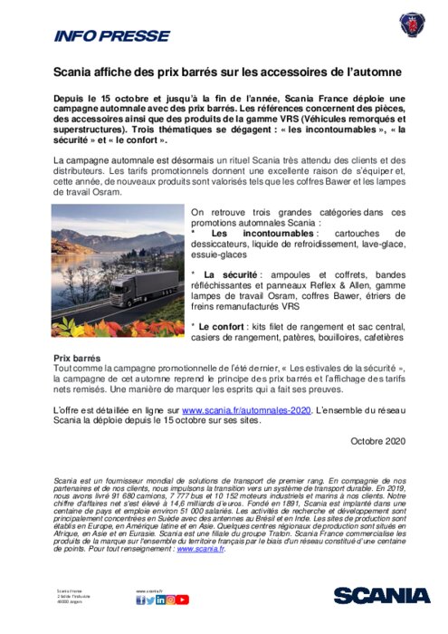 Depuis le 15 octobre et jusqu'à la fin de l'année, Scania France déploie une campagne automnale avec des prix barrés. Les références concernent des pièces, des accessoires ainsi que des produits de la gamme VRS (Véhicules remorqués et superstructures). Trois thématiques se dégagent : " les incontournables ", " la sécurité " et " le confort ".