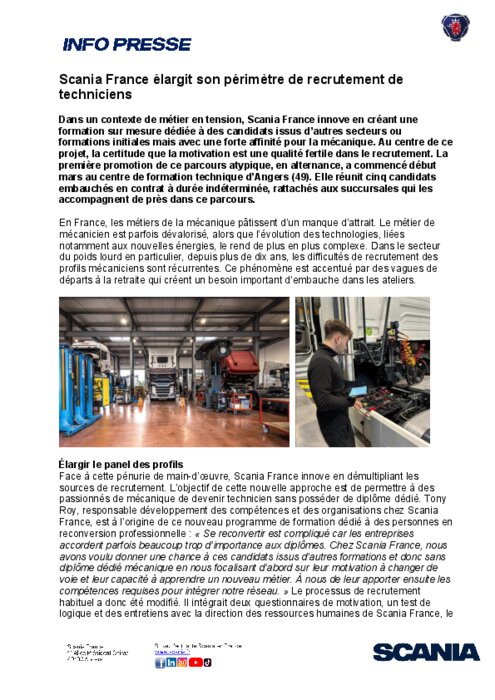 Dans un contexte de métier en tension, Scania France innove en créant une formation sur mesure dédiée à des candidats issus d’autres secteurs ou formations initiales mais avec une forte affinité pour la mécanique. Au centre de ce projet, la certitude que la motivation est une qualité fertile dans le recrutement. La première promotion de ce parcours atypique, en alternance, a commencé début mars au centre de formation technique d’Angers (49). Elle réunit cinq candidats embauchés en contrat à durée indéterminée, rattachés aux succursales qui les accompagnent de près dans ce parcours.