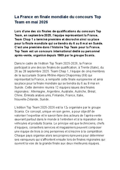 Lors d’une des six finales de qualifications du concours Top Team, en septembre 2025, l’équipe représentant la France, Team Chap 1 a terminé première et décroché ainsi sa place pour la finale mondiale qui se tiendra du 6 au 8 mai en Suède. C’est une première dans l’histoire Top Team pour la France. Top Team est un concours international dédié au personnel après-vente, organisé depuis 1989 par le groupe Scania.