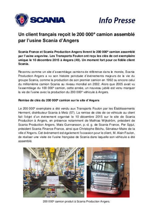 Scania France et Scania Production Angers livrent le 200 000e camion assemblé par l’usine angevine. Les Transports Foulon ont reçu les clés de cet exemplaire unique le 10 décembre 2015 à Angers. Un moment fort pour ce fidèle client Scania.
