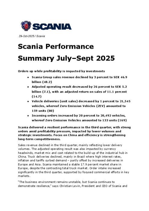 Scania a affiché une bonne résistance au troisième trimestre, avec un carnet de commandes bien rempli malgré une pression sur la rentabilité, affectée par la baisse des volumes et les investissements stratégiques. L'accent mis sur la Chine et l'efficacité renforce la compétitivité à long terme.