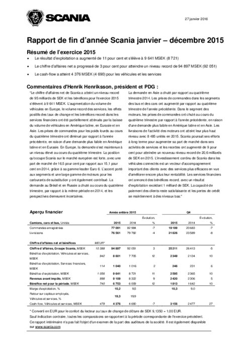 Le chiffre d'affaires net de Scania a atteint un niveau record de 95 milliards de SEK et les bénéfices pour l'exercice 2015 s'élèvent à 9 641 MSEK. L'augmentation du volume de véhicules en Europe, le volume record des services, les effets positifs des taux de change et les bénéfices record dans les services financiers ont été partiellement atténués par la baisse du volume de véhicules en Amérique latine, en Eurasie et en Asie.