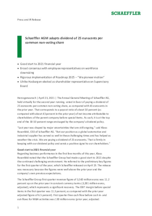 L'Assemblée générale annuelle de Schaeffler AG, qui s'est tenue pratiquement pour la deuxième année consécutive, a voté en faveur du versement d'un dividende de 25 centimes d'euros par action ordinaire sans droit de vote, contre 45 centimes d'euros l'année précédente. Cela correspond à un taux de distribution d'environ 50% (contre environ 43% l'année précédente) du bénéfice net attribuable aux actionnaires de la société mère avant éléments exceptionnels...