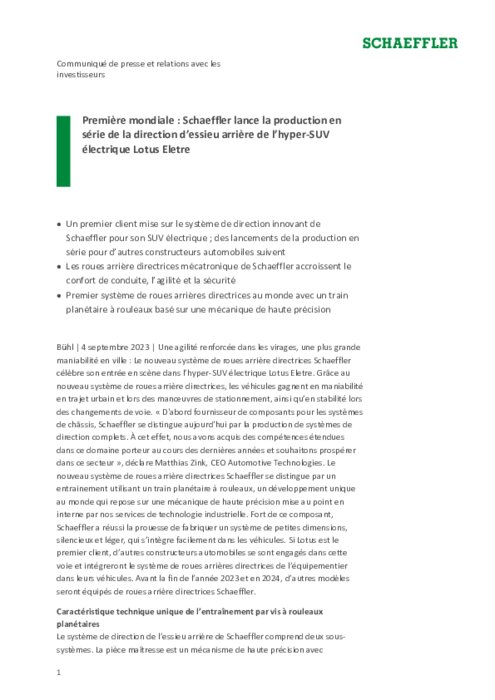 C'est une première mondiale : le nouveau système de roues arrière directrices Schaeffler a été choisi pour équiper l’hyper-SUV électrique Lotus Eletre. Une première qui va être suivie par des lancements de la production en série pour d’autres constructeurs automobiles.