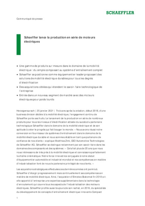 Schaeffler récolte les fruits de sa décision de créer, il y a 3 ans, début 2018, un pôle d’activité dédié à la mobilité électrique. Le démarrage de la production de masse pour de multiples produits à tous les niveaux d’électrification témoigne de l’engagement réussi de Schaeffler dans le domaine de la mobilité électrique et de son statut de partenaire technologique pour faire progresser le monde. Schaeffler s’impose comme un fournisseur leader de mobilité électrique durable à tous les niveaux...