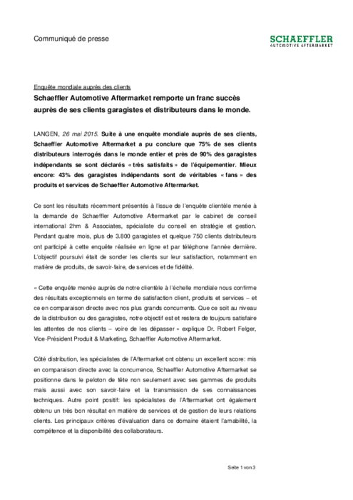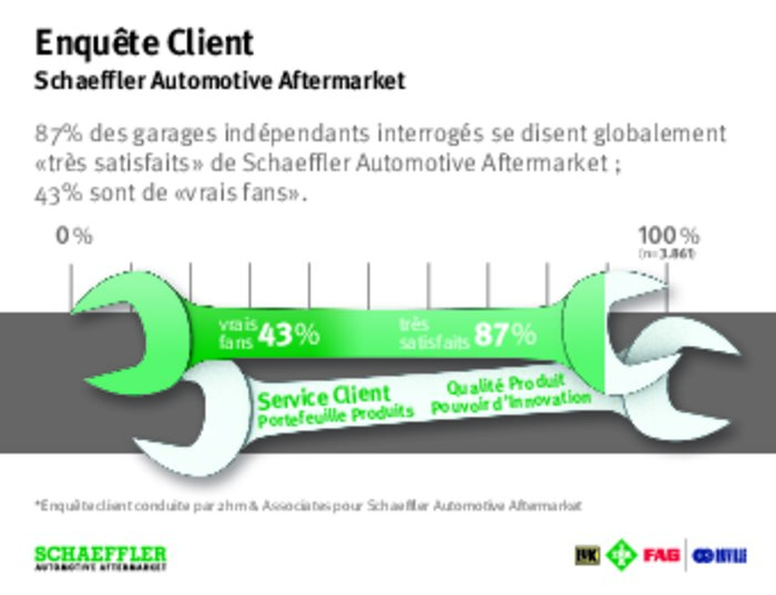Suite à une enquête mondiale auprès de ses clients, Schaeffler Automotive Aftermarket a pu conclure que 75% de ses clients distributeurs interrogés dans le monde entier et près de 90% des garagistes indépendants se sont déclarés « très satisfaits » de l’équipementier. Mieux encore: 43% des garagistes indépendants sont de véritables « fans » des produits et services de Schaeffler Automotive Aftermarket.
