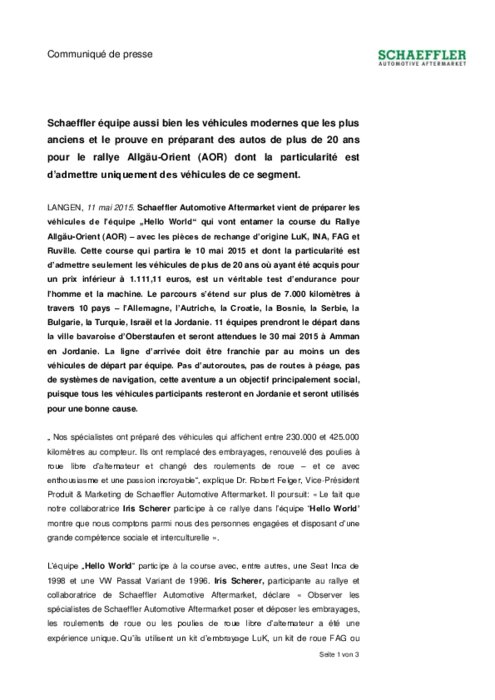 Schaeffler équipe aussi bien les véhicules modernes que les plus anciens et le prouve en préparant des autos de plus de 20 ans pour le rallye Allgäu-Orient (AOR) dont la particularité est d’admettre uniquement des véhicules de ce segment.