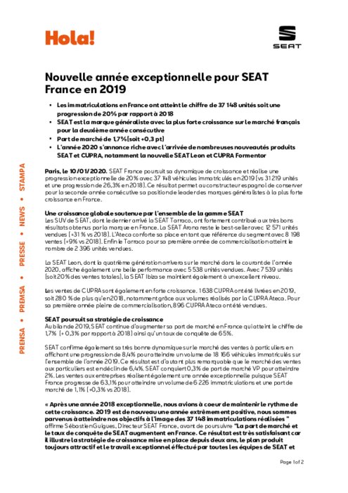 SEAT France poursuit sa dynamique de croissance et réalise une progression exceptionnelle de 20% avec 37 148 véhicules immatriculés en 2019 (vs 31 219 unités et une progression de 26,3% en 2018]. Ce résultat permet au constructeur espagnol de conserver pour la seconde année consécutive sa position de leader des marques généralistes à la plus forte croissance en France.