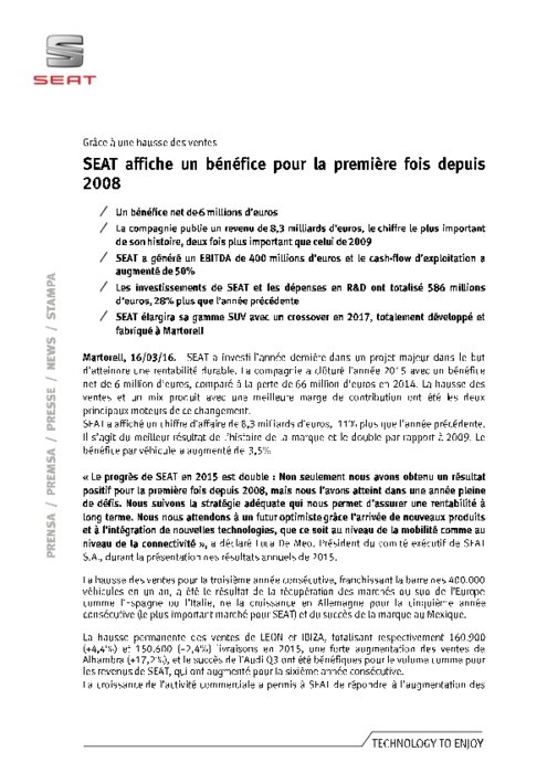 SEAT a investi l’année dernière dans un projet majeur dans le but d’atteindre une rentabilité durable. La compagnie a clôturé l’année 2015 avec un bénéfice net de 6 million d’euros, comparé à la perte de 66 million d’euros en 2014. La hausse des ventes et un mix produit avec une meilleure marge de contribution ont été les deux principaux moteurs de ce changement. SEAT a affiché un chiffre d’affaire de 8,3 milliards d’euros, 11% plus que l’année précédente.
