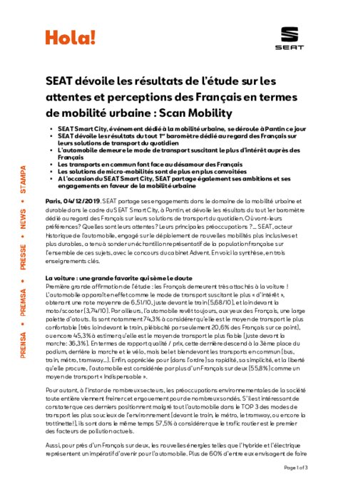 SEAT partage ses engagements dans le domaine de la mobilité urbaine et durable dans le cadre du SEAT Smart City, à Pantin, et dévoile les résultats du tout 1er baromètre dédié au regard des Français sur leurs solutions de transport du quotidien. Où vont-leurs préférences? Quelles sont leurs attentes? Leurs principales préoccupations ?...