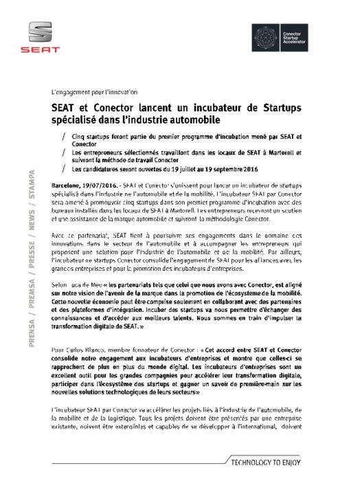 SEAT et Conector s’unissent pour lancer un incubateur de startups spécialisé dans l’industrie de l’automobile et de la mobilité. L’incubateur SEAT par Conector sera amené à promouvoir cinq startups dans son premier programme d’incubation avec des bureaux installés dans les locaux de SEAT à Martorell. Les entrepreneurs recevront un soutien et une assistance de la marque automobile et suivront la méthodologie Conector.