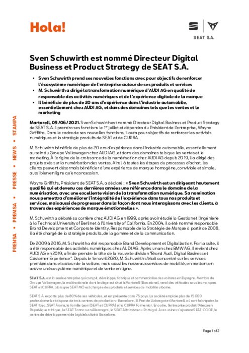 Sven Schuwirth est nommé Directeur Digital Business et Product Strategy de SEAT S.A. Il prendra ses fonctions le 1er juillet et dépendra du Président de l'entreprise, Wayne Griffiths. Dans le cadre de ses nouvelles fonctions, il aura pour objectifs de renforcer les activités numériques et la stratégie produits de SEAT et de CUPRA.